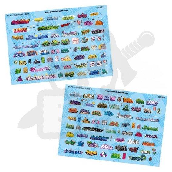 Każdy arkusz kalkomanii modelarskiej zawiera szeroką gamę graffiti w różnych rozmiarach i kształtach, które pozwolą Ci spersonalizować wagony i inne pojazdy kolejowe w modelu lub dioramie. Niektóre wzory zawierają wycięcia u dołu, imitujące te występujące w rzeczywistości, ponieważ wiele pociągów jest często przerywanych przez framugi drzwi, spód wagonu lub elementy mechaniczne. Artyści plastycy miejscy malują na tym, co jest dostępne, często nie kontynuując malowania poniżej niektórych elementów.