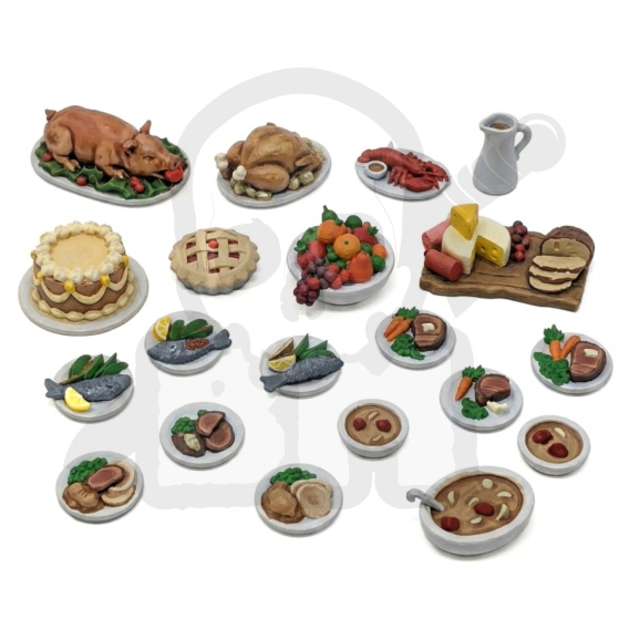 Wydrukowane w 3D z wysokiej jakości żywicy, te miniatury precyzyjnie oddają kształt i fakturę różnych potraw, wnosząc dodatkowy poziom immersji do Twoich projektów modelarskich i bitewnych. Spraw, aby Twoje postacie mogły delektować się dobrym talerzem przed bitwą!