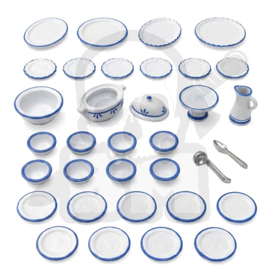 Zawiera zróżnicowany wybór talerzy, misek, dzbanka, wazy na zupę z pasującą łyżką, salaterki oraz dużych talerzy do prezentacji różnych potraw.
