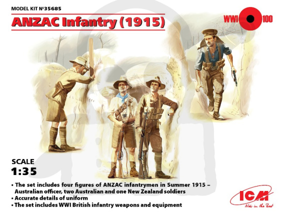 Zestaw zawiera 48+74 części do złożenia 4 figurek piechoty ANZAC z okresu 1915.