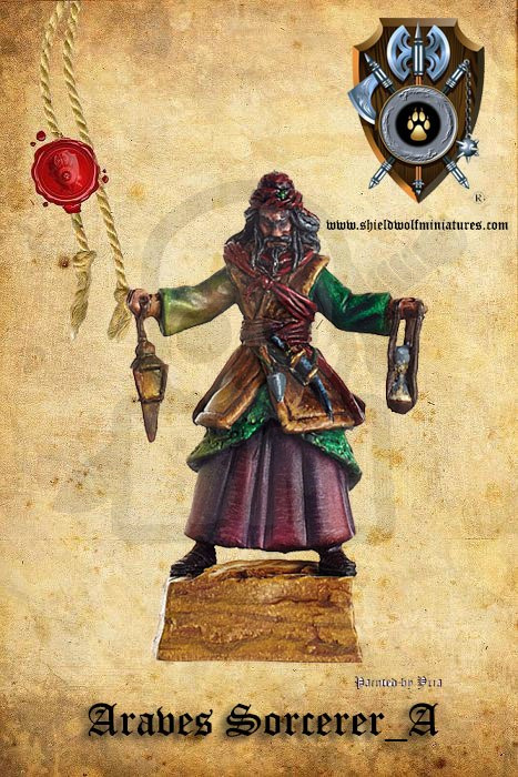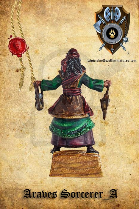 This product contains one fine detailed resin Araves Sorcerer A miniature. Model supplied with plastic20mm square base.