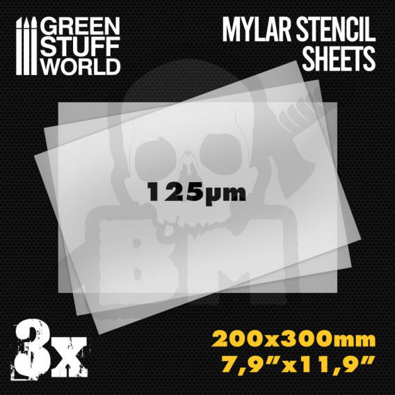 Arkusze z cienkiego półprzezroczystego plastiku mylarowego do tworzenia własnych szablonów. Plastik Mylar jest wytrzymały, a jednocześnie wystarczająco cienki, aby łatwo wycinać kształty i formować, aby tworzyć szablony do malowania aerografem i pędzlem.