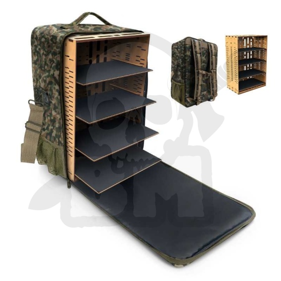 Ten plecak, mieszczący ponad 200 figurek, jest idealny dla osób, które muszą przenosić dużą liczbę figurek na turnieje, sesje gier lub wystawy. Miniatury są rozmieszczone na czterech poziomach, co pozwala na sprawną i łatwą organizację. System przechowywania uzupełniają wyjmowane, metalizowane tacki, które ułatwiają układanie i dostęp do figurek. Tacki z płyty MDF mają samoprzylepną, metalową powłokę, która zapewnia stabilną i bezpieczną podstawę dla namagnesowanych figurek. Plecak zawiera cztery tacki oraz 21 regulowanych wysokości, co pozwala na dostosowanie przestrzeni wewnętrznej do indywidualnych potrzeb każdego użytkownika i rozmiaru figurek.