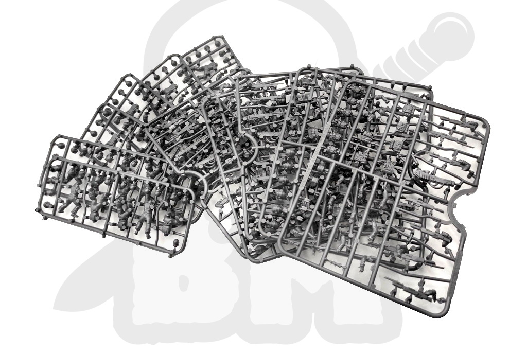 This box set includes enough parts to build 30 hard plastic troops with standard rifles and plasma weapons along with grenades, pistols, backpacks, and other accessories to customize your force. Four different head types allow for very different looks for your team. Alternatively you can use them for planetary or near future militia, escaped prisoners, starship crew, and more.