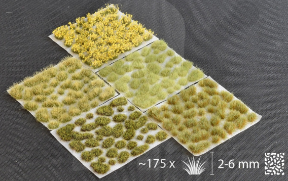 Zestaw Highland Tuft zawiera 5 arkuszy o wymiarach 7,25 cm x 6,5 cm, kępki mają od 2- 6 mm wysokości. Znajdują się tam: