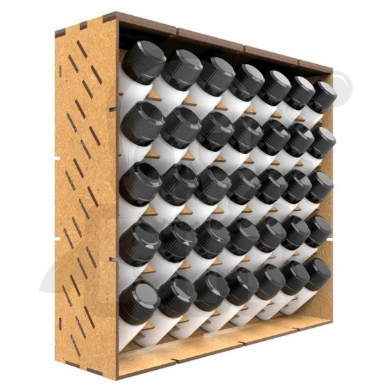 Modułowy organizer na pojemniki na farby wykonany z wysokiej jakości drewna MDF. Wiele z tych modułów można łączyć poziomo i pionowo, aby zwiększyć pojemność. Jest dostarczany niezmontowany, ale jest bardzo łatwy w montażu. Jeśli chcesz go wzmocnić, zalecamy użycie standardowego białego kleju PVA (klej do drewna).
