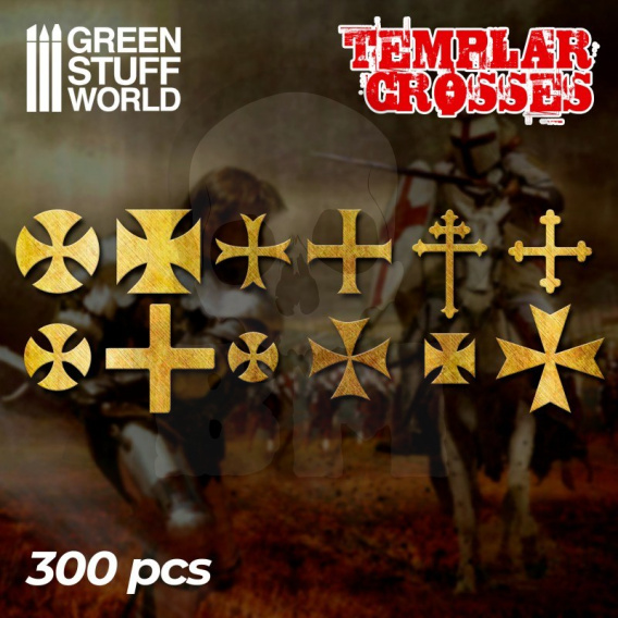 Kolekcja 300 symboli Krzyża Templariuszy i znaków wykonanych z mosiądzu. Do wyboru jest 12 różnych typów, podzielonych na różne przedziały. Idealnie nadają się do dodawania detali do zbroi, broni i sztandarów modeli i miniatur lub do dekoracji dioram. Zalecamy stosowanie kleju cyjanokrylowego w małych ilościach.