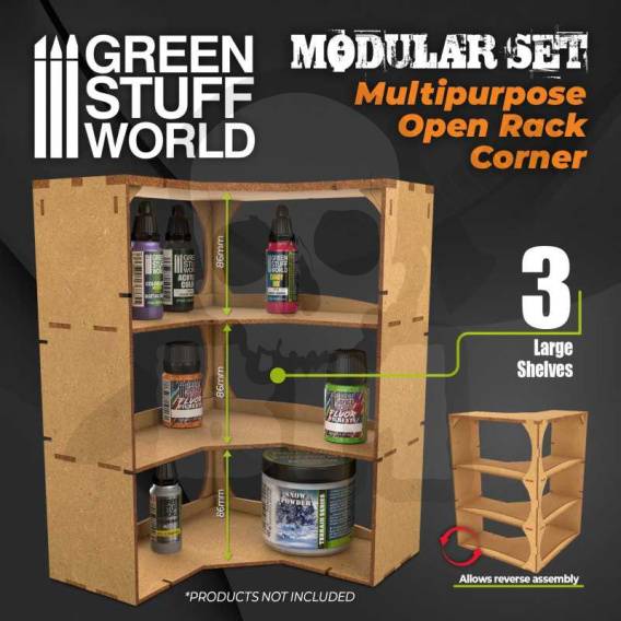 Wielozadaniowy otwarty stojak MDF, idealny do łączenia z naszymi modułami organizatora farb. Zalecamy użycie białego kleju do solidnego wykończenia.
